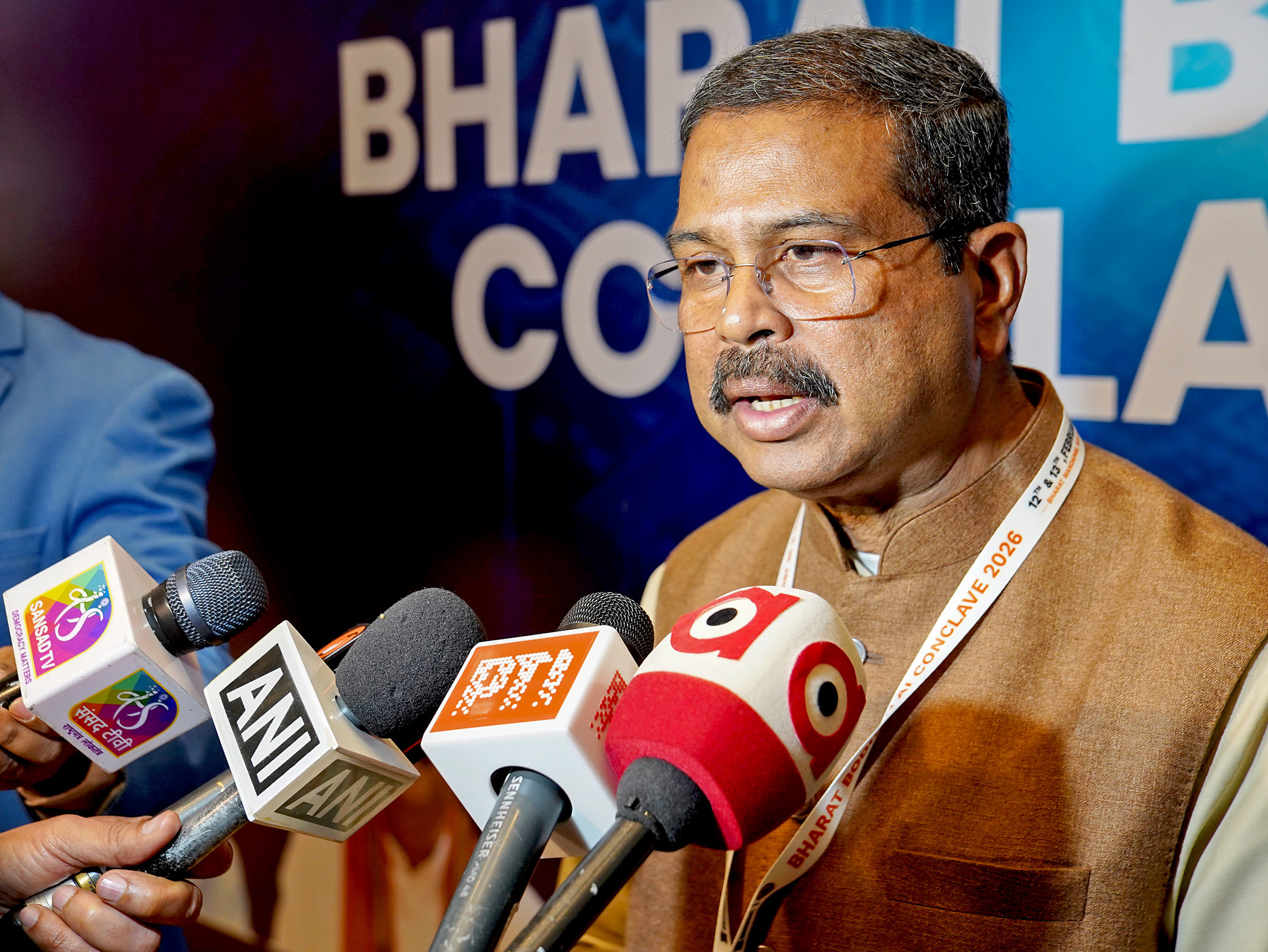 The Union Minister for Education, Shri Dharmendra Pradhan interacting with media during the ‘Bharat Bodhan AI Conclave-2026’ at Bharat Mandapam, in New Delhi on February 12, 2026. - (Thursday,12-February-2026) |